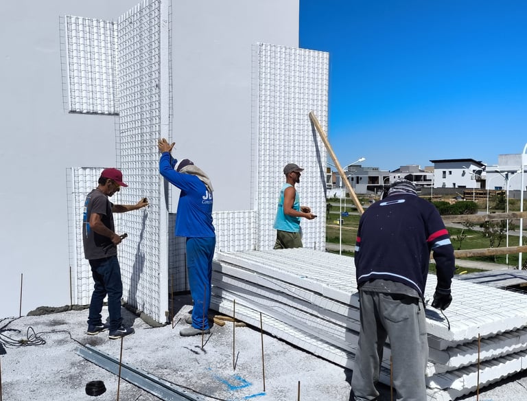 Sistema Monolítico: A inovação reside em malhas de aço em ambos os lados do EPS, que formam uma estrutura interconectada. Após a montagem, aplica-se argamassa ou concreto, criando uma parede estrutural única e resistente, como um bloco monolítico, distribuindo as cargas por toda a edificação.